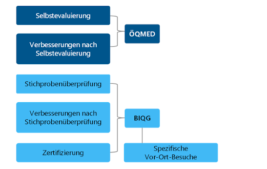 Neu ist seit 2024, dass die darauf folgenden stichprobenartigen Vor-Ort-Besuche durch das BIQG vorgenommen werden. Es wird eine Zufallsstichprobe aus allen österreichischen Ordinationen und Gruppenpraxen gezogen, und die in die Stichprobe fallenden Praxen werden durch einen sogenannten Peer besucht. Ein Peer ist eine erfahrene Ärztin oder ein erfahrener Arzt, die oder der zusätzlich zur langjährigen Berufserfahrung, welche eine Grundvoraussetzung für den Einsatz als Peer ist, noch an einer entsprechenden Schulung teilnimmt. So kann der Vor-Ort-Besuch optimal gestaltet werden. Gemeinsam und auf Augenhöhe sollen Verbesserungspotenziale erkannt und in Angriff genommen werden.